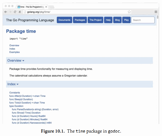 第二个工具,名字也叫godoc,它提供可以相互交叉引用的HTML页面,但是包含和go doc命令相同以及更多的信息。图10.1演示了time包的文档,11.6节将看到godoc演示可以交互的示例程序。godoc的在线服务 https://godoc.org ,包含了成千上万的开源包的检索工具。
