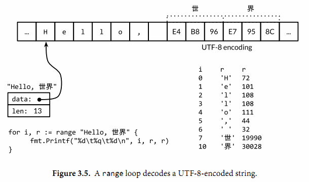 每一次调用DecodeRuneInString函数都返回一个r和长度,r对应字符本身,长度对应r采用UTF8编码后的编码字节数目。长度可以用于更新第i个字符在字符串中的字节索引位置。但是这种编码方式是笨拙的,我们需要更简洁的语法。幸运的是,Go语言的range循环在处理字符串的时候,会自动隐式解码UTF8字符串。下面的循环运行如图3.5所示;需要注意的是对于非ASCII,索引更新的步长将超过1个字节。