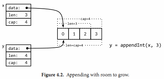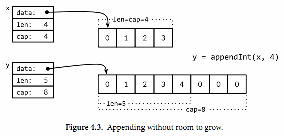 让我们仔细查看i=3次的迭代。当时x包含了[0 1 2]三个元素,但是容量是4,因此可以简单将新的元素添加到末尾,不需要新的内存分配。然后新的y的长度和容量都是4,并且和x引用着相同的底层数组,如图4.2所示。