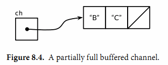 那么channel的缓存队列将不是满的也不是空的(图8.4),因此对该channel执行的发送或接收操作都不会发生阻塞。通过这种方式,channel的缓存队列解耦了接收和发送的goroutine。